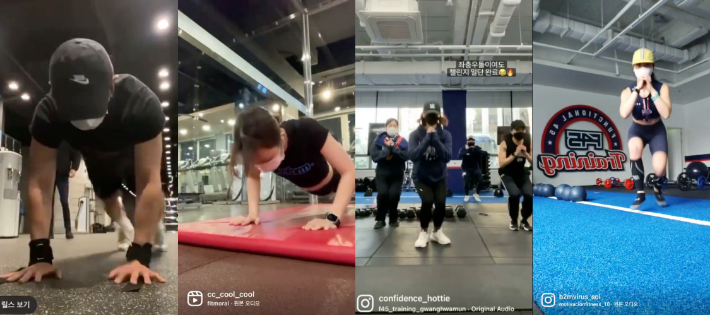 챌린지에 참여한 정의준, 최시원, 차유진, 박은미 씨. 본인제공서울 종로구의 한 체육관(F45)에서는 함께 운동하는 사람들과 챌린지를 통해 유대감을 쌓고 있다. 챌린지를 전파한 체육관 회원 정의준(28)씨는 우연히 노래에 맞춰 운동하는 인스타그램 릴스 영상을 보고 영감을 얻었다.