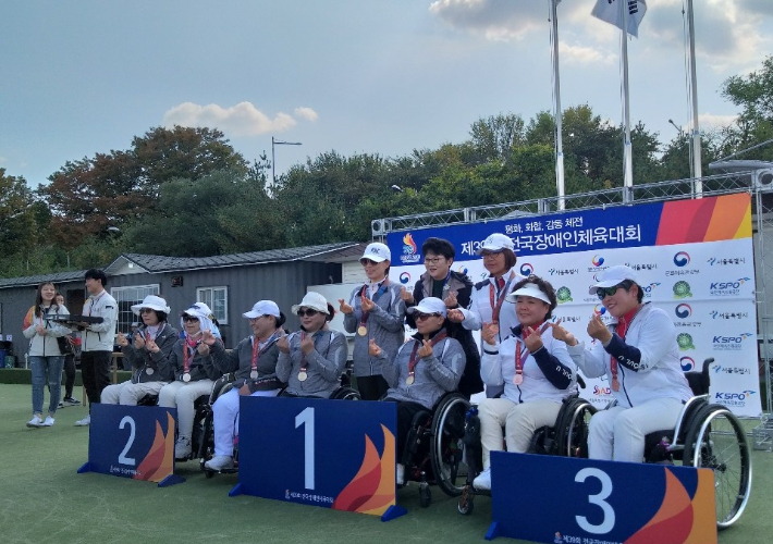 2019년 제39회 전국 장애인 체육대회에서, 여자 B7 3인조 동메달을 차지한 권오숙 씨(사진 오른쪽 끝)가 시상식이 끝난 뒤 포즈를 취했다. 권오숙 제공역사는 짧다. 5년의 연륜, 유아기를 막 벗어났다. 서울 장애인론볼연맹에 등록한 6개 클럽 가운데 막내다.